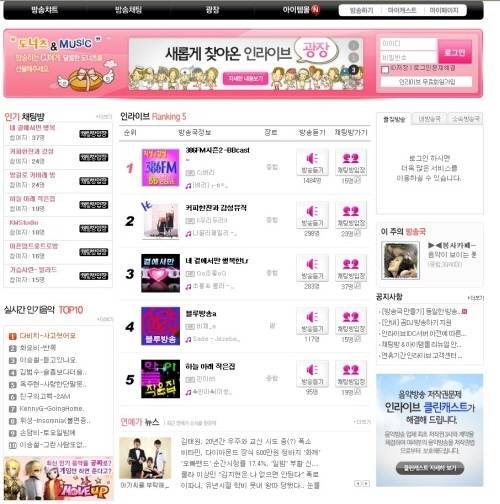 개설일 : 1999년 12월주접속자연령층 : 20대 - 40대회원 수 : 약 82만명이름 뜻 : 인터넷 음악방송의 가장 큰 특징인 실시간방송이라는 점을 생각하고 '인라이브'라 지었다. 실시간 음악스트리밍 음악방송이란 뜻.소개: 인라이브는 음악방송에 필요한 서버를 갖춘 인터넷 방송국이다. 방송은 물론 청취자들이 즐길 수 있도록 채팅방, 실시간 음악정보, 연예가뉴스 등도 서비스한다. |