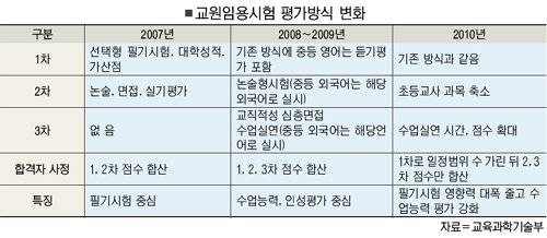 그런데 이 시험방식이 내년부터 또 바뀐다. 교과부는 수업능력에 대한 평가를 강화하기 위해 3차에서 시행하는 수업실연 시간을 기존 10분에서 20∼30분으로 확대하고 배점도 10점 이상 늘리기로 했다. 1차 필기시험은 최종 합격점수에 넣지 않고 '합·불'로만 판단, 영향력을 줄이고 최종합격자는 2, 3차 시험점수만 합산해 결정할 계획이다. 또 초등 2차시험 논술형평가의 과목도 줄이기로 했다. 이렇게 되면 수업실연 등 3차 시험의 실질 영향력이 현재보다 훨씬 커질 전망이다.