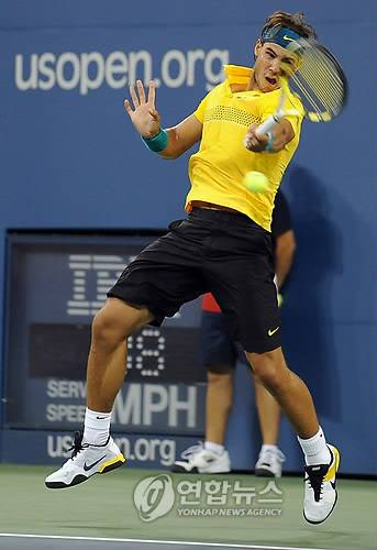 epa01848434 Rafael Nadal of Spain returns a shot from Nicolas Kiefer of Germany during the fifth day of the 2009 US Open Tennis Championship at the USTA National Tennis Center in Flushing Meadows, New York, USA 04 September 2009. The Open runs through Sunday 13 September 2009. EPA/ANDREW GOMBERT < 실시간 뉴스가 당신의 손안으로..연합뉴스폰 >< 포토 매거진 >< 저작권자(c)연합뉴스. 무단전재-재배포금지. >