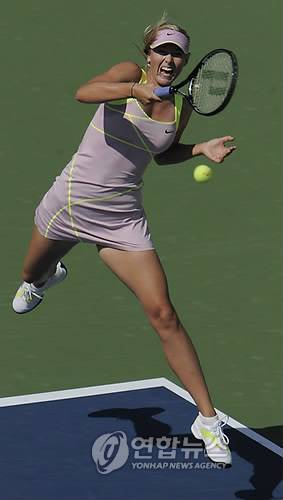 epa01849450 Maria Sharapova of Russia hits a return against Melanie Oudin of the US during the sixth day of the 2009 US Open Tennis Championship at the USTA National Tennis Center in Flushing Meadows, New York, USA 05 September 2009. The Open runs through Sunday 13 September 2009. EPA/JUSTIN LANE < 실시간 뉴스가 당신의 손안으로..연합뉴스폰 >< 포토 매거진 >< 저작권자(c)연합뉴스. 무단전재-재배포금지. >
