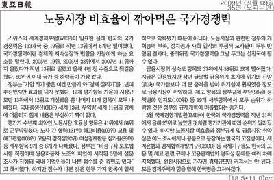 동아일보는 한술 더 떴다. "노동시장과 관련한 정부의 개혁능력 부족, 정치권과 사회 일각의 투쟁적 노사관이 두루 반영된 결과"라면서 "중하위권 국가 경쟁력을 그냥 두고는 선진국이 될 수 없다"고 비판을 쏟아냈다. 이 신문은 "노동시장 비효율과 정부규제 및 금융시장 취약성은 어느 조사에서나 공통으로 등장하는 한국의 고질병"이라면서 "선진시장으로 가자면 경제규모만 커져서는 안 되고 모든 경제주체가 힘을 합쳐 한국병을 고쳐야 한다"고 주장했다.