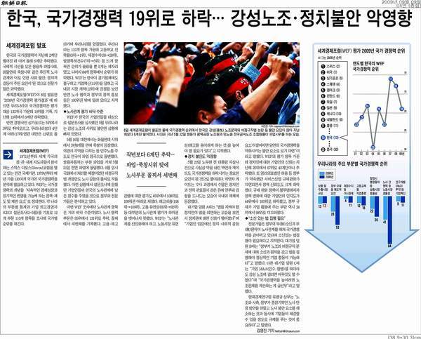 그런데도 조선일보는 "국제적 시선을 모은 쌍용차 파업 사태, 화물연대 죽창 시위 같은 후진적 노사관계와 이로 인한 사회 불안, 정치적 갈등이 주된 요인"이라고 평가했다. 이 신문은 WEF 보고서를 인용해 "노사관계를 선진화해야 하고 노동시장 유연성을 높여야 할 필요가 있다"고 지적하기도 했다. 오히려 대결적 노사관계를 조장하고 노동시장 유연성을 높여야 한다고 주장하는 이 신문이 국가 경쟁력을 떨어뜨리는데 일조하고 있을 가능성이 크다.