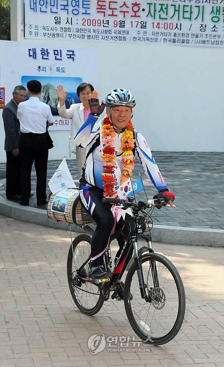 (부산=연합뉴스) 김선호 기자 = 부산의 한 60대 월남참전용사가 동서화합과 독도 수호 등을 위해 자전거 전국일주에 나서 눈길을 끌고 있다. 1945년 해방둥이인 박남우(맨 왼쪽) 씨가 17일 부산을 출발해 40여일 동안 4천㎞를 떠나기 전 자전거 동호회원들과 파이팅을 외치고 있다. < < 관련기사 있음 > > 2009.9.17