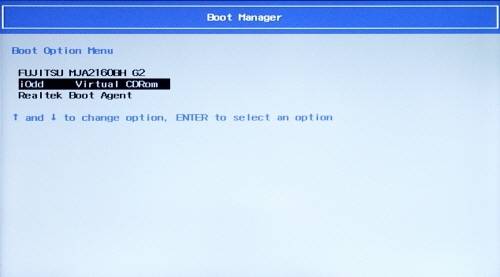 바이오스 설정없이 iOdd로 부팅하기바이오스로 들어가 설정하지 않고도 요즘 메인보드는 단축키를 눌러 부팅 장치를 선택하는 기능을 갖추고 있다. 단축키는 메인보드 제조사에 다른 데, 바이오스 첫 화면에 표시된다. 일반적으로 Esc, F8, F9, F11 등이 많이 쓰인다. 단축키를 누르면 뜨는 [부트 매니저] 화면. [iOdd Virtual CDRom] 을 골라 엔터 키를 누르면 부팅된다.