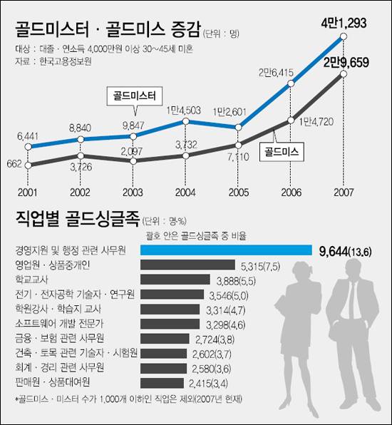 노동부 산하 한국고용정보원이 최근 펴낸 연구보고서 < 고학력 전문직 미혼 남녀의 취업구조 분석 및 정책적 시사점 > 에 따르면, 대졸ㆍ연소득 4,000만원 이상의 30~45세 미혼 남성이 2001년 6,441명에서 2007년 4만1,293명으로 폭증했다. 같은 조건의 '골드미스'도 2001년 662명에서 2007년 2만9,659명으로 크게 늘었으나, 골드미스터보다는 약 1만2,000명 적었다.