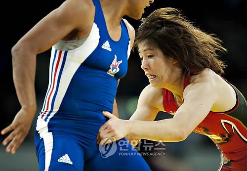 epa01872725 Saori Yoshida (R) of Japan fights with Gomis of France, in the womens 55 kilo in the World Wrestling Championships in Herning, western Denmark on 24 September 2009. Saori Yoshida won the match and will fight in the final 24 September 2009. EPA/HENNING BAGGER DENMARK OUT < 실시간 뉴스가 당신의 손안으로..연합뉴스폰 >< 포토 매거진 >< 저작권자(c)연합뉴스. 무단전재-재배포금지. >