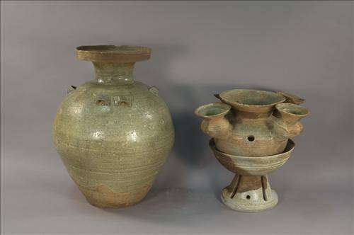 이 토기는 그릇받침과 함께 발견됐다.더불어 4호 석실분에서는 5세기 중국 남조에서 수입한 것으로 생각되는 청자가 동남쪽 모서리에서 발견됐다. 몸통 어깨를 돌아가며 4군데에 각각 2개씩의 귀(耳)를 장식한 이런 청자는 무령왕릉에서 출토된 적이 있다.