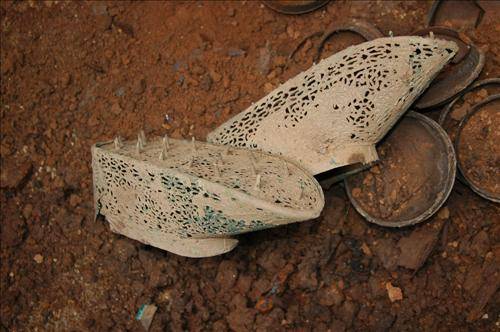 신발은 발치 쪽에서 약간 비스듬히 뉘어진 상태로 발견됐다. 이중 우측 신발 내부에는 뼈가 남아있었고 좌측신발에선 직물류 흔적이 발견됐다.