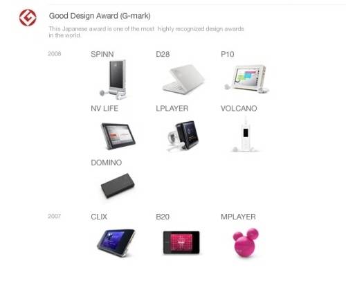 굿디자인 어워드를 수상한 아이리버 제품들. 이외에도 많은 제품이 해외의 권위있는 상을 받았다. |