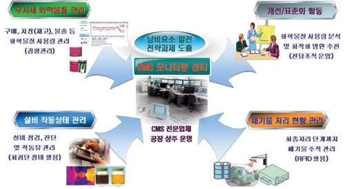 최근 저탄소 녹색 성장 및 글로벌 환경 규제 대응이 기업의 경영 이슈로 대두되면서 한국 제조업 생존 전략의 하나로 화학물질관리서비스(CMS:Chemical Management Service)가 주목받고 있다. CMS는 사업장에서 취급하는 화학물질의 구매, 운반, 저장(재고), 사용, 폐기 등 전 과정(Life Cycle)에 대해 제품과 서비스의 일부 또는 전부를 공급 및 관리하기 위한 고객(Customer)과 공급 업체(Provider) 간의 전략적이고 장기적인 계약으로 수행되는 비즈니스 모델이다.