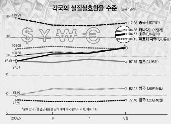 국제결제은행(BIS)에 따르면 2009년 8월 원화와 달러의 실질실효환율은 각각 77.4와 91.99를 기록했습니다. 원화가 달러보다 실질실효환율이 낮으니 원ㆍ달러 환율의 추가 하락 여지가 있는 셈입니다. 실제 9월 평균(9월 28일까지) 원ㆍ달러 환율은 8월 평균 1,238.4에서 16.4원 하락한 1,222원을 기록했습니다.