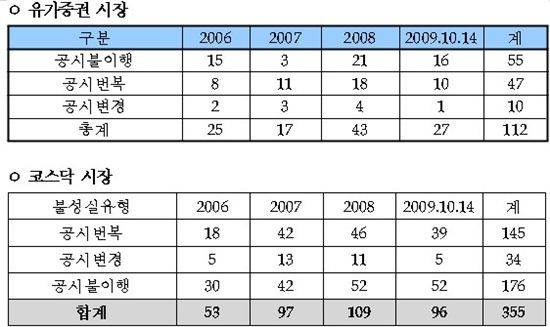 15일 신학용 국회 정무위 민주당 의원이 한국거래소 국정감사를 앞두고 거래소로부터 제출받은 자료에 따르면 올해 들어 유가증권 시장의 불성실공시는 감소했으나 코스닥시장의 불성실공시는 증가했다. 유가증권시장의 불성실 공시는 2006년 25건, 2007년 17건, 2008년 43건, 2009년(10월14일 기준) 27건으로 전년대비 증가세가 주춤하고 있으나 코스닥시장의 불성실공시는 같은기간 각각 53건, 97건,109건, 96건으로 눈에 띄게 증가하고 있는 것으로 드러났다.