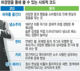◇허위와 정치 패러디=지난달 18일 서울 홍익대 앞 한 클럽에 모인 500여명의 20, 30대는 "허경영"을 연호했다. 허씨의 콘서트는 겉으로만 보면 유명 가수의 그것과 비슷했다. 탁현민 한양대 문화콘텐츠학과 겸임교수는 허씨를 '르네상스 시대의 광우(狂愚·바보 같은 행동으로 사람들에게 웃음을 준 사람)'로 표현했다. 정체된 시기, 그러면서도 변화를 눈앞에 둔 때에 사람들은 비현실적인 것을 즐기고, 이를 통해 현실의 불만족을 해소한다는 것이다.