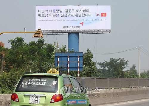 (하노이=연합뉴스) 김선한 특파원 = 오는 20일부터 22일까지 이명박 대통령의 베트남 방문을 앞두고 17일 베트남 수도 하노이의 노이바이국제공항에서 시내로 들어오는 도로에 이 대통령 내외의 방문을 환영하는 한국 기업체들의 대형 입간판이 들어서 눈길을 끌고 있다. 사진은 금호아시아나그룹의 환영 입간판. 2009.10.17