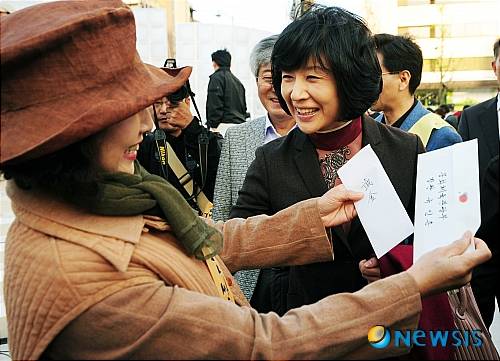 【서울=뉴시스】이동훈 기자 = 17일 오후 서울 광화문 광장에서 열린 '김만덕 나눔쌀 만섬 쌓기'에서 유인촌 장관을 대신해 참석한 부인 강혜경씨가 고두심 조직위원장에게 기부금을 전달하고 있다.