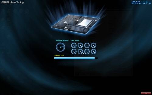 ※ 코어 i7 860(2.9GHz)로 테스트. 오토 튜닝은 시스템 안정성을 테스트하다가 문제가 생기면 스스로 재부팅한다. 부팅 뒤 클록을 좀 더 높이거나 재부팅 전에 확인한 최고 클록을 설정을 고정할 수 있다. 역시 인텔 스피드스텝 등의 절전 기술은 비활성화되고 바이오스의 클록 관련 메뉴도 자동으로 변경된다. 시스템 환경에 따라 오버클록 폭이 달라질 수 있다.