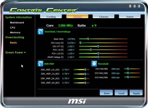 MSI 컨트롤 센터는 시스템 각 부분의 상태, CPU 클록과 전압 조절, 에너지 절전 모드 등을 제어한다. 오버클록 메뉴도 빠뜨리지 않았는데 효과는 미미한 편이다.