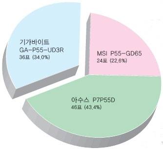 후보로 오른 제품은 기가바이트의 GA-P55-UD3R과 아수스의 P7P55D, 그리고 MSI의 P55-GD65 등이다. 총 106명이 이번 투표에 참여한 가운데, 아수스 P7P55D가 46표로 가장 많은 표를 얻어 1위에 뽑혔다. 아수스 메인보드와 뜨거운 경쟁을 보였던 기가바이트 GA-P55-UD3R은 10표 차이로 2위에 머물렀고 MSI P55-GD65는 24표를 얻는데 그쳤다.