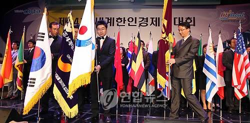 (서울=연합뉴스) 한상균 기자 = 제14차 세계한인경제인대회가 21일 서울 쉐라톤워커힐 호텔에서 개막했다. 세계해외한인무역협회, 서울시, 연합뉴스가 공동개최한 이번 대회는 32개국에 퍼져 있는 세계해외한인무역협회 회원 750여 명과 국내 227개 기업이 참가해 역대 최대규모로 열렸다. 참가국 국기에 이어 개최측 깃발이 입장하고 있다. 2009.10.21