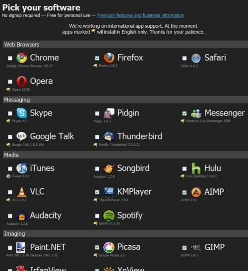 브라우저 : 크롬, 파이어폭스, 사파리, 오페라메신저 & 커뮤니케이션 : 스카이프, 피드긴, 윈도 라이브 메신저, 구글 토그, 썬더버드미디어 : 아이튠즈, 송버드, 훌루, VLC, KMP, AIMP, 오더시티, 스포티피이미지 : 페인트닷넷, 피카사, GIMP, Irfan뷰, Xn뷰문서 : 오피스(시험판), 오픈오피스, 어도비 리더, 폭스잇리더, 큐트PDF안티바이러스 : MS 시큐리티 에센셜, 아바스트 안티바이러스 홈, AVG 프리 안티-바이러스런타임 : 플래시 플레이어, 플래시 플레이어(IE), 자바 JRE, 닷넷프레임워크, 실버라이트파일 공유 : 유토런트, 이뮬기타 : 드롭박스, 에버노트, 범프톱, 구글 어스유틸리티 : Img번, C클리너, 라운시, 레보, 디프레글러, 리얼VNC, CD버너XP, 레쿠바압축 : 7-집, 윈RAR개발자 툴 : 파이손, 파일질라, 노트패드++, JDK, 윈SCP, PuTTY, 이클립스 |