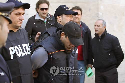 epa01916363 Camorra boss Salvatore Russo (C) is escorted by unidentified police officiers out of Naples police headquarters, 31 October 2009. Salvatore Russo is allegedly the head of a corporate crime clan of Naples surroundings, and before being arrested was included in a list of 30 most dangerous fugitives. EPA/CESARE ABBATE < 실시간 뉴스가 당신의 손안으로..연합뉴스폰 >< 포토 매거진 >< 저작권자(c)연합뉴스. 무단전재-재배포금지. >