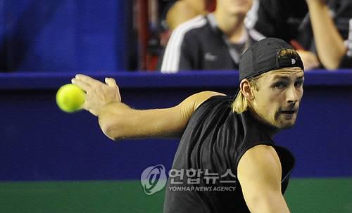 epa01926670 Lukasz Kubot of Poland returns the ball to Andreas Beck of Germany during their first round match at the BNP Paribas 2009 Masters Tennis tournament in Paris, France, 09 November 2009. EPA/HORACIO VILLALOBOS < 뉴스의 새 시대, 연합뉴스 Live >< 연합뉴스폰 >< 포토 매거진 >< 저작권자(c)연합뉴스. 무단전재-재배포금지. >