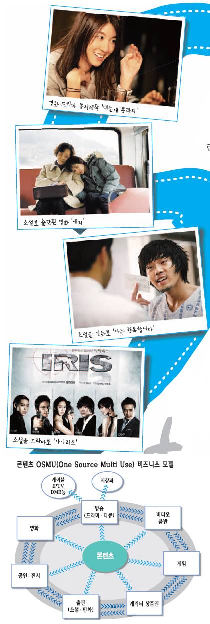 이 외에도 지금 한국 문화계는 '킬러 콘텐츠' 발굴을 위해 이종 매체 간의 교류 협력이 활발히 이루어지고 있다. 한국콘텐츠진흥원은 지난 달 국내 최대 규모의 콘텐츠 개발 사업인 '대한민국 신화(新話) 창조 프로젝트'를 발표했다. 2010년까지 총 125억원을 투자, 공모전을 통한 스토리 발굴부터 시나리오 완성과 작품 제작·배급에 이르는 전 과정을 지원한다는 내용이다. 영화사, 드라마작가협회, 게임회사 등 다양한 콘텐츠 제작업체가 참여할 계획이다. 프라임엔터테인먼트와 살림출판사가 공동 제정한 '대한민국문학·영화콘텐츠대전' 역시 OSMU 콘텐츠 발굴이 목적이다. 출판·만화·영화 3개 부문에서 아이디어를 공모했다.