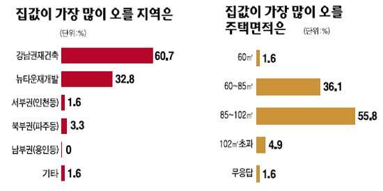 눈에 띄는 것은 집값하락을 예측한 응답자들 역시 가격이 가장 많이 내릴 곳으로 강남권 재건축(43.8%)을 꼽았다는 점이다. 집값상승이나 하락을 예측한 응답자들 모두 집값 변동의 중심으로 '강남권 재건축'을 지목했다는 것은 그만큼 이 지역에 대한 시장의 평가가 극명하게 엇갈리고 있다는 반증으로 풀이된다.