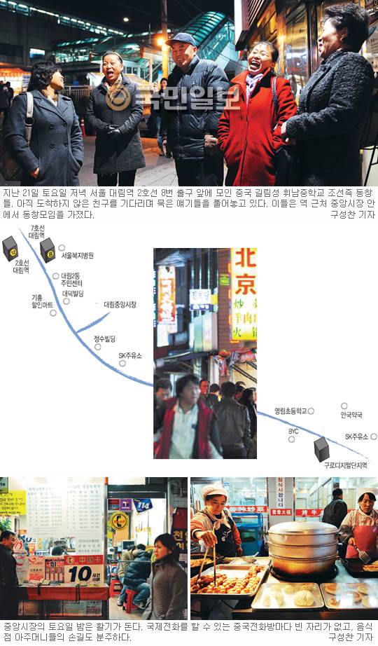 21일 저녁 8번 출구 앞. 한 귀퉁이에서 50대 조선족 남녀 다섯 명이 친구를 기다리고 있다. 중국 길림성 통화지구 휘남현에 소재한 휘남중학교를 1975년도에 졸업한 동창들이라고 한다. 어디서 왔냐고 물어보니 신도림, 신대방, 송파, 영등포, 구로시장 등 제각각이다. 이들은 이날 중앙시장 내 식당에서 휘남중 동창모임을 갖기로 했다. 중국에서도 못했던 동창모임이다.