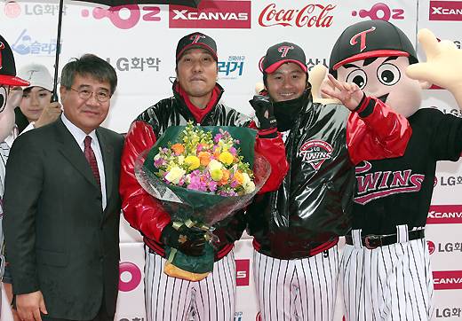 2009년 명예선수로 위촉된 이문세씨가 2008년 명예선수인 배우 공형진, LG트윈스 이영환단장과 기념사진을 찍고 있다./사진제공=LG 트윈스