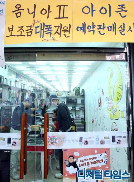 조성훈기자 hoon21@◆사진설명 : 삼성전자가 '아이폰'에 대응하기 위해 '옴니아2'의 가격을 내리면서 일반 휴대전화인 '아몰레드'보다 출고가가 낮아지는 현상이 발생했다. 2일 서울 용산의 한 이동통신대리점이 '옴니아2 보조금 대폭 지원'이라는 문구를 내걸고 영업을 하고 있다.