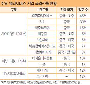 미용뿐 아니라 피부미용(이지은레드클럽, 미플), 네일아트(세시네일, 그라시아) 등도 미국과 중국에 진출했다. 코트라에 따르면 지난해 국외 진출한 뷰티 관련 신규 법인 수는 122개, 투자금액은 2539만달러인 것으로 나타났다.