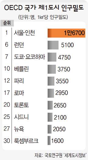 서울의 인구밀도는 오이시디 국가의 제1도시 가운데 미국 뉴욕(2050명)과 오스트레일리아 시드니(2100명)의 8배, 이탈리아 로마(2950명)의 5배, 프랑스 파리(3550명)와 독일 베를린(3750명)의 4배, 일본 도쿄·요코하마(4750명)와 영국 런던(5100명)의 3배에 이르는 것이다.