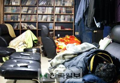 영하 10도의 매서운 추위가 기승을 부린 지난 17일 새벽 3시. 갈데 없는 일용직 근로자들이 가장 싼 값에 잠자리를 해결할 수 있다는 서울 영등포역 근처 지하1층 A다방 문을 열자 퀴퀴한 냄새가 숨을 턱 막았다. 오래된 옷ㆍ가방에서 풍기는 곰팡이 냄새와 고린 발 냄새, 바닥에 쌓인 담배 냄새까지 뒤섞여 이곳을 처음 찾은 뜨내기들은 5분도 참지 못하고 밖으로 뛰쳐나갈 정도였다.