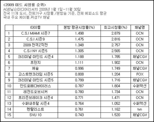 시청률조사기관 AGB닐슨 미디어리서치에 따르면 2009년 한 해 동안 국내 주요 케이블, 위성TV 영화채널에서 방송된 신작 미드의 시청률을 조사한 결과 OCN에서 방송된 'C.S.I 마이애미 시즌 7'(평균시청률 1.498%, 최고시청률 2.879%)이 전체 미드 중 1위를 차지했다.