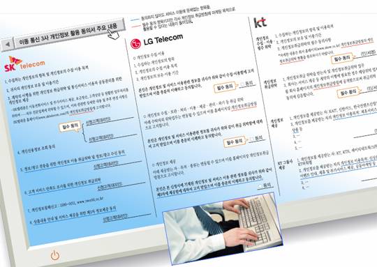 KT도 필수동의 항목에 '고객 혜택 이벤트 정보 안내 등의 마케팅 활동'이란 내용이 있었다. KT는 "표기가 잘못된 것이다. 고치겠다"고 말했다. LG텔레콤 역시 '온라인 이벤트 마케팅'이 필수동의 항목에 있었다. "개선작업을 진행 중"이라고 밝혔다.