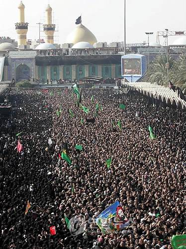 epa01975339 Shiite Muslims take part in a religious procession of Ashura near the holy shrine of Imam Husain in Karbala, southern Iraq, 27 December 2009. Muslims across the world are observing Muharram, the first month of Islamic calender, the climax of Muharram is the Ashura festival commemorating the martyrdom of Imam Hussein a grandson of the Prophet Mohammed in the Iraqi city of Karbala in the seventh century. EPA/ALAA AL-SHEMAREE < 뉴스의 새 시대, 연합뉴스 Live >< 연합뉴스폰 >< 포토 매거진 >< 저작권자(c)연합뉴스. 무단전재-재배포금지. >