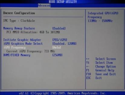 바이오스 GPU 항목 구성P7H55-M 프로의 바이오스는 여느 그래픽 내장 메인보드와 다르지 않다. 내장 그래픽을 강제로 끄거나 자동으로 작동하게 선택할 수 있고 클록과 메모리 용량 설정 메뉴가 존재한다. 아쉬운 점이라면 PCI 익스프레스 x16 그래픽 슬롯에 그래픽카드를 꽂으면 자동으로 클락데일 GPU가 비활성화된다는 것이다. AMD나 엔비디아의 통합 칩셋은 같은 제조사의 그래픽카드를 꽂으면 모니터를 4개까지 연결하는 서라운드뷰나 그래픽 성능을 높이는 하이브리드 그래픽 등으로 활용할 수 있다.