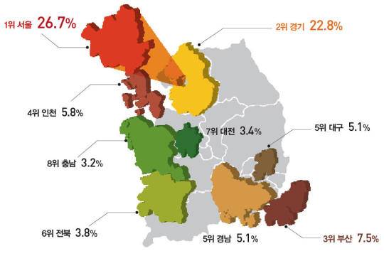 현재 거주하고 있는 주거 지역이 어딘지를 묻는 질문에 전체 응답자 중 26.7%가 서울이라고 답했으며 22.8%가 경기, 7.5%가 부산, 인천이 5.8% 순으로 뒤를 이었다. 대구와 경남이 각각 5.1%, 전북 3.8%, 대전 3.4%, 충남 3.2%의 비중을 차지했다. 이는 각 지역별 판매액의 비율과도 유사한 수치인 것으로 조사됐다.