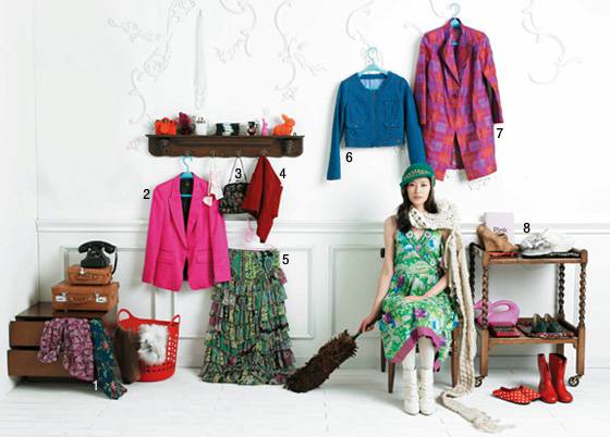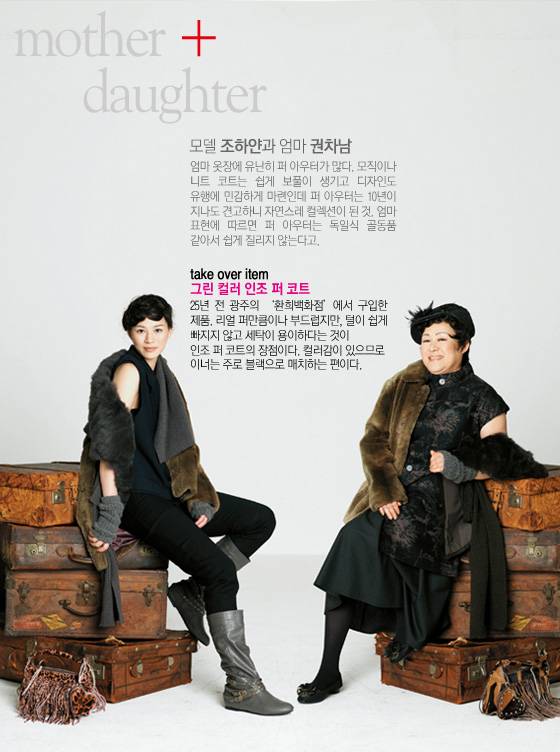 ◆ 딸_깃털 장식 베스트 5만3천8백원 포에버21, 모직 롱 베스트 5만9천8백원 행텐, 화이트 컬러 오픈 토 슈즈 29만8천원 왓아이원트, 비즈 장식 클러치 7만5천원 엠주, 퍼 장식 모자 가격미정 헬렌카민스키.
