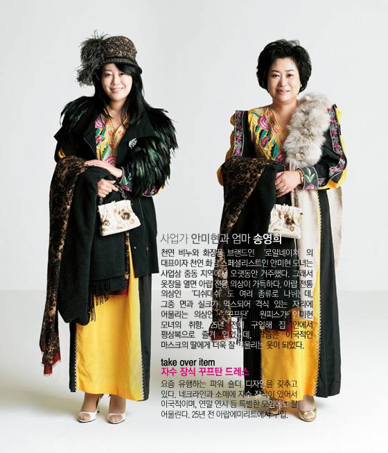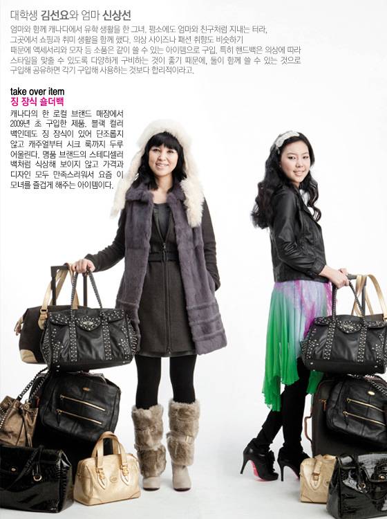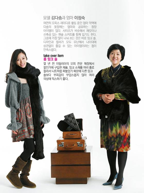 ◆ 딸_과장된 소매 디자인의 니트 볼레로 가격미정 레쥴렉션 by 이주영, 튜브 톱 원피스 가격미정 김동순 울티모, 어그부츠 22만9천원 오스트레일리아, 밍크 소재 클러치 1백20만원 동우모피, 레이스 소재 클러치 23만8천원 포에버21.