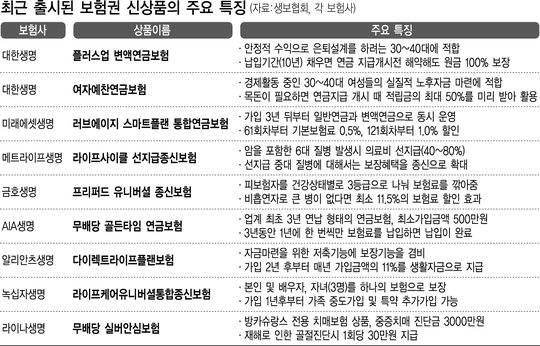 보험사들이 연금보험과 종신보험을 중심으로 신상품을 잇따라 내놓고 있다. 금융위기 이후 시장에서 멀어지던 변액연금보험은 물론 여성을 타깃으로 한 연금보험 상품도 출시됐다. 가족 전체의 질병을 보장하는 통합보험, 암 등 중대 질병의 보장혜택을 종신까지 확대한 상품도 판매되고 있다.