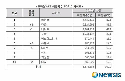 또 보고서에 따르면 모바일에서도 유선과 마찬가치로 네이버와 다음, 네이트 순의 3강 구도가 자리잡는 모습이다. 모바일 웹 사이트 순이용자수의 경우 네이버가 444만 명, 다음이 252만 명, 네이트가 226만 명 순으로, 유선 웹에서와 동일한 포털 3강의 순서로 정렬됐다. 이어 구글, 버스정보안내, 유튜브, G마켓 등 순이다.