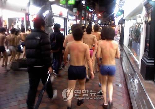 10일 오후 7시께 청주시 성안길에서는 팬티만 입은 중학교 졸업생으로 보이는 남학생 20여명이 인파로 붐비는 시내 한복판을 20여분간 행진했다.