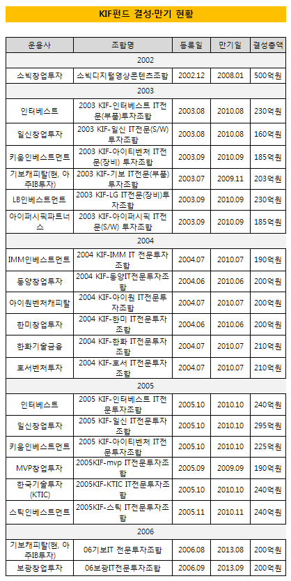 [머니투데이 정소완기자][청산절차 밟는 펀드는 총 20개]더벨|이 기사는 02월10일(14:08) 머니투데이가 만든 프로페셔널 정보 서비스 'thebell'에 출고된 기사입니다.2010년 만기가 도래하는KIF(Korea Information Technology Fund) 조합이 총 17개인 것으로 조사됐다.