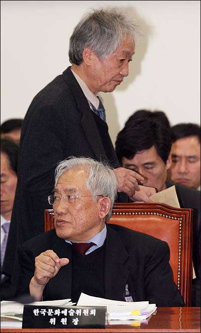 이날 오후 속개된 문방위 전체회의에서도 두 위원장은 나란히 기관장석에 앉았지만 문방위원들로부터 질의는 받지 않았다. 한나라당과 민주당 양당 간사가 '문화예술위 두 위원장 사태가 어느 정도 정리된 뒤에 업무보고를 받기로' 합의하고 두 위원장을 퇴장하도록 했기 때문이다.
