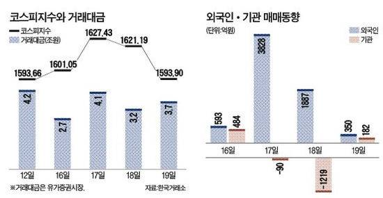 19일 코스피지수는 27.29포인트(1.68%) 내린 1593.90에 거래를 마쳐 거래일 기준 나흘 만에 1600선 아래로 떨어졌다. 지난 17일 거의 한 달 만에 되찾았던 20일 이동평균선(1609)도 다시 내줬다. 유가증권시장의 거래대금도 이틀째 3조원대에 그쳤다.