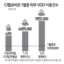 CJ헬로비전 "1월중 한파 닥친날 20~30% 늘어"동장군이 기승을 부리면 주문형비디오(VOD) 이용자가 크게 늘어나는 것으로 나타났다.22일 국내에서 디지털 케이블TV 방송 가입자가 가장 많은 CJ헬로비전에 따르면, 지난 1월 중 전날보다 최저기온(이하 서울 기준)이 내려간 15일 간의 하루 평균 유ㆍ무료 VOD 이용건수는 62만여 건으로 1월 평균(53만8,000건)보다 약 15% 많았다.