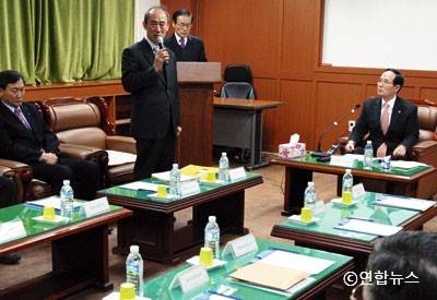 2월17일 안병만 교육과학기술부 장관(오른쪽)이 알몸 뒤풀이로 문제가 된 중학교를 방문해 간담회를 가졌다. |