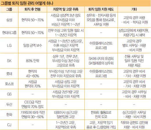 한화그룹은 대표이사 이상에게는 상근고문, 일반 임원에게는 고문 직위가 주어진다. 상근고문에게는 비서, 사무실, 기사, 차량을 제공한다. 두산그룹은 일반 임원으로 퇴직하면 2년 동안 직전 연봉의 70%를 준다. 부사장 이상은 3년 동안 연봉의 70% 정도를 받는다. CJ그룹은 1~2년간 고문이나 자문역으로 위촉한다. 고문이나 자문역이 끝나면 CJ클럽에 가입한다. 직위와 공헌도를 감안해서 차량이나 비서가 지원된다. 신세계는 퇴직임원들에게 1~2년간 비상임 고문직을 부여하고, 퇴직 시 기본급 수준의 임금을 지급한다.